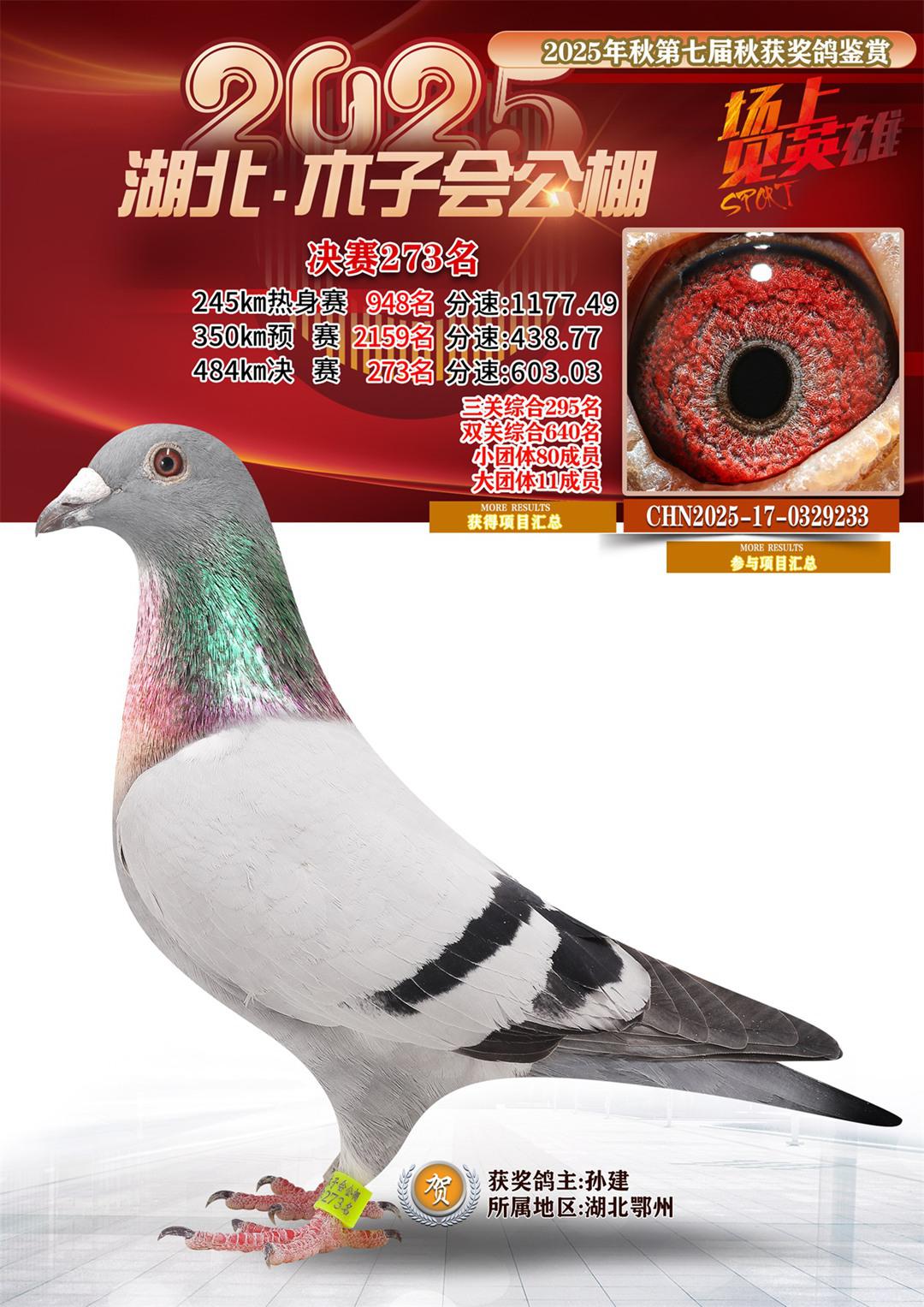 湖北省木子会公棚2025决赛273名孙建17-0329233湖北鄂州获奖鸽展示!