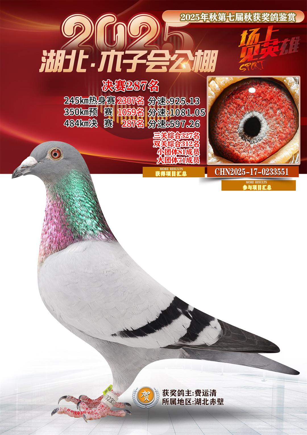 湖北省木子会公棚2025决赛287名费运清17-0233551湖北赤壁获奖鸽展示!