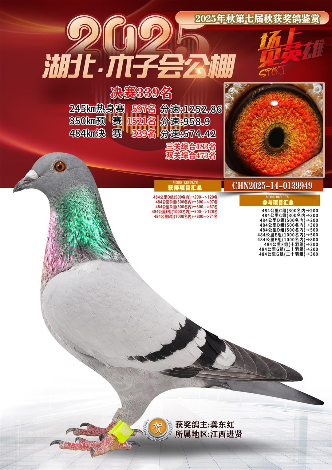 湖北省木子会公棚2025决赛339名龚东红14-0139949江西进贤获奖鸽展示!
