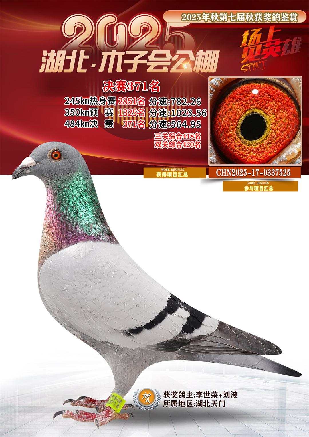 湖北省木子会公棚2025决赛371名李世荣+刘波17-0337525湖北天门获奖鸽展示!