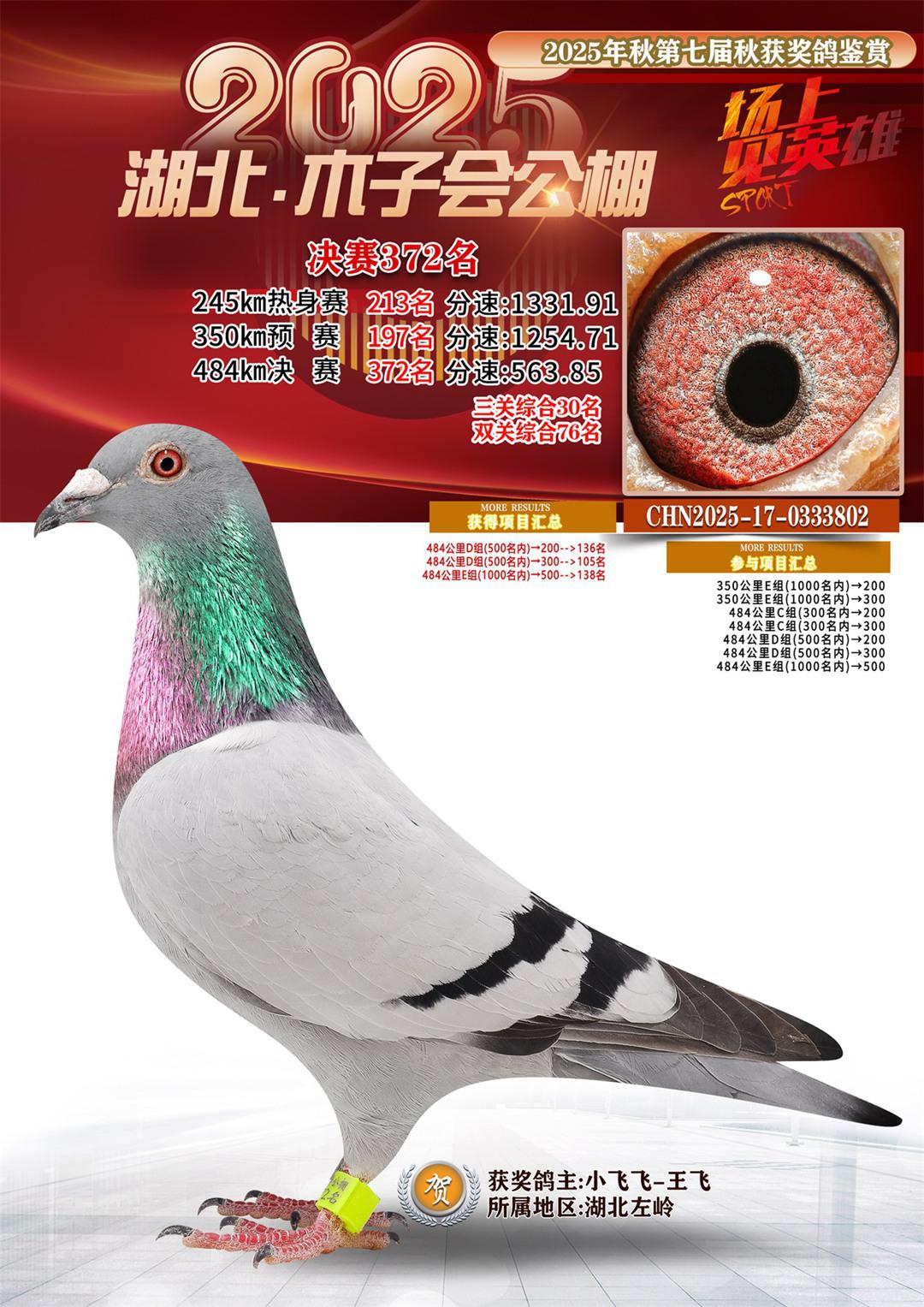 湖北省木子会公棚2025决赛372名小飞飞-王飞17-0333802湖北左岭获奖鸽展示!