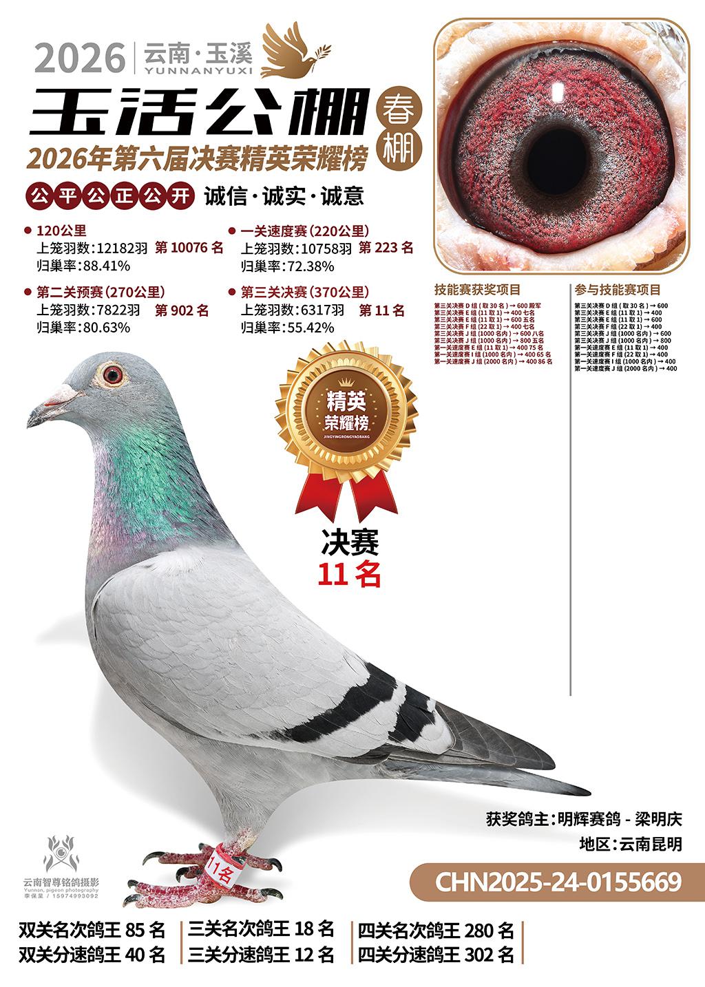 云南玉活公棚春棚2026决赛11名明辉赛鸽-梁明庆2025-24-0155669云南昆明获奖鸽展示!