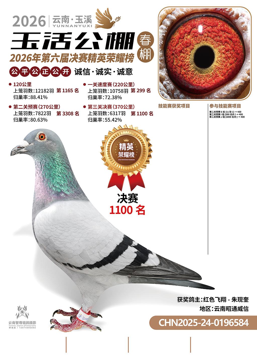 云南玉活公棚春棚2026决赛1100名红色飞翔-朱现奎2025-24-0196584云南昭通威信获奖鸽展示!