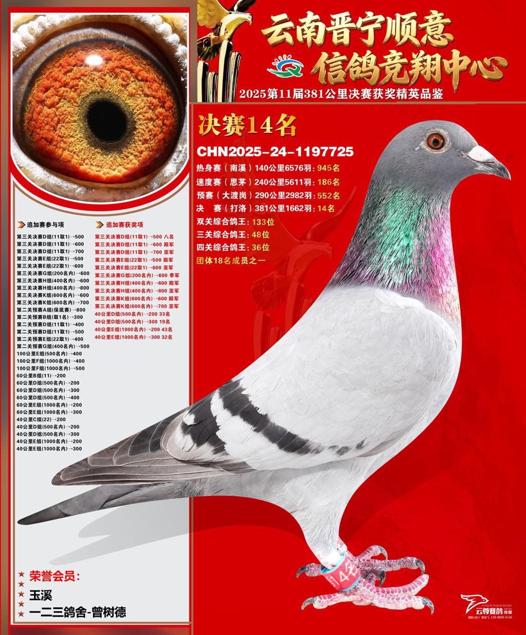 云南晋宁顺意信鸽竞翔中心2025决赛14名一二三鸽舍-曾树德2025-24-1197725玉溪获奖鸽展示!