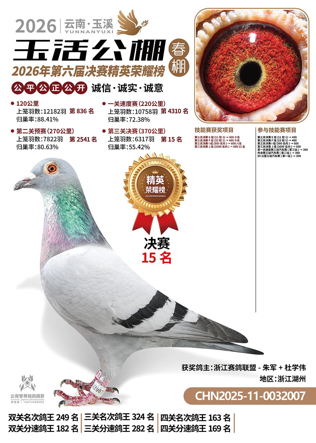 云南玉活公棚春棚2026决赛15名浙江赛鸽联盟-朱军+杜学伟2025-11-0032007浙江湖州获奖鸽展示!