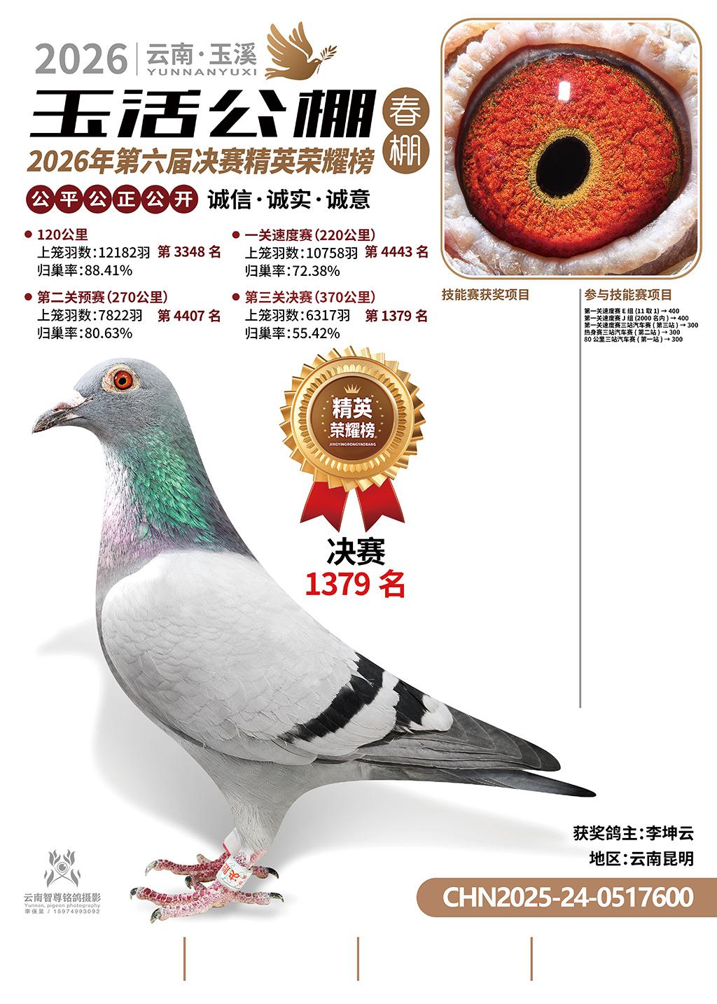 云南玉活公棚春棚2026决赛1379名李坤云2025-24-0517600云南昆明获奖鸽展示!
