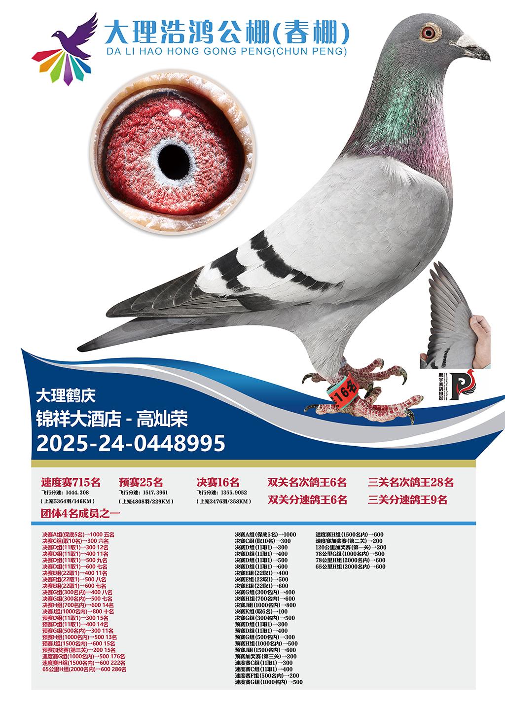 大理浩鸿公棚春棚2026决赛16名锦祥大酒店-高灿荣2025-24-0448995大理鹤庆获奖鸽展示!