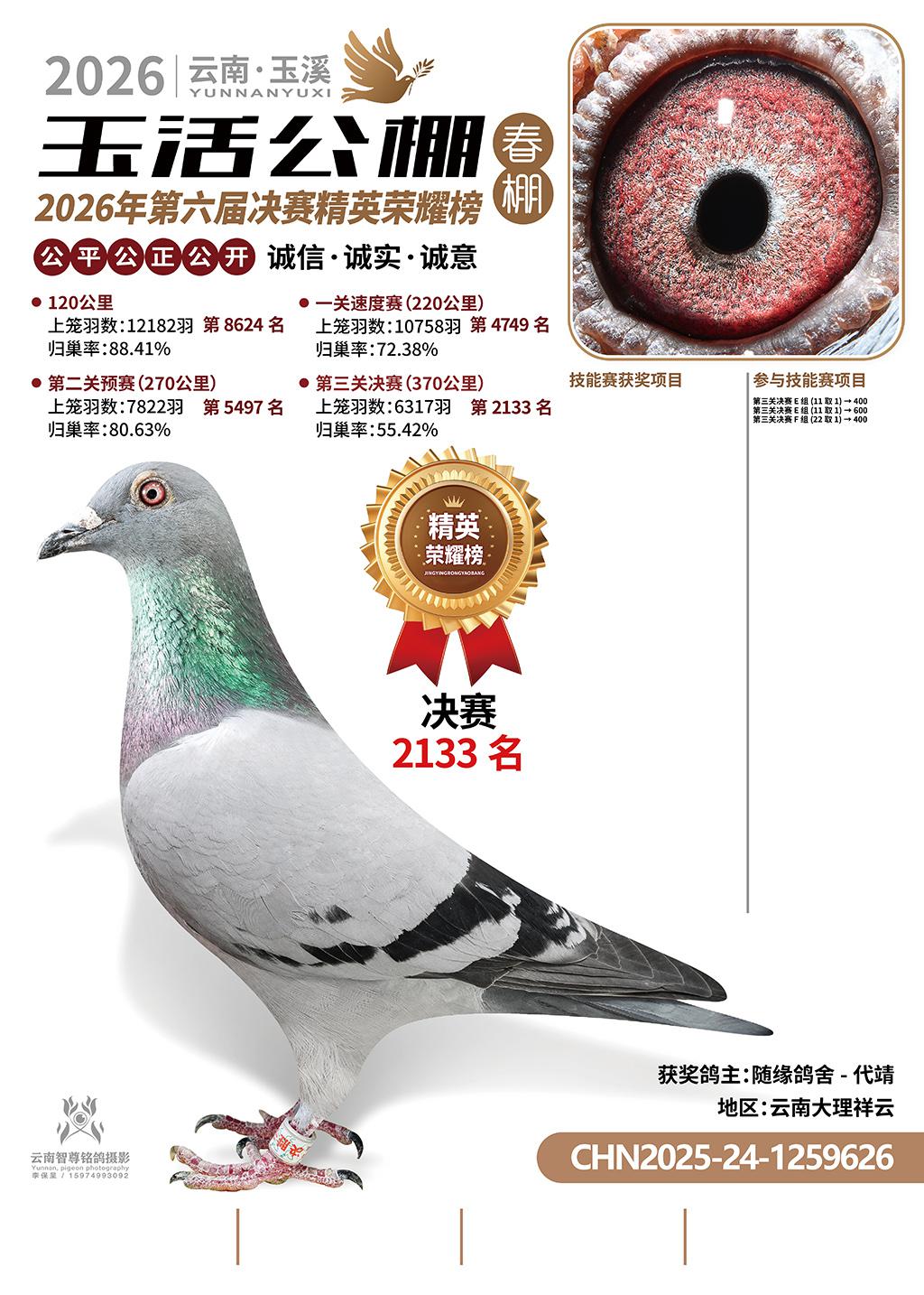 云南玉活公棚春棚2026决赛2133名随缘鸽舍-代靖2025-24-1259626云南大理祥云获奖鸽展示!