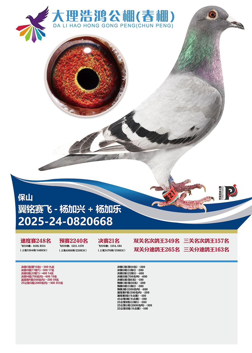 大理浩鸿公棚春棚2026决赛21名翼铭赛飞-杨加兴+杨加乐2025-24-0820668保山获奖鸽展示!