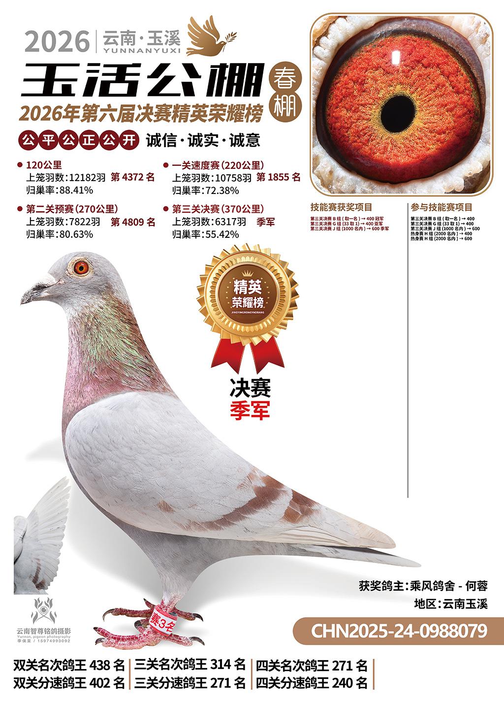 云南玉活公棚春棚2026决赛3名乘风鸽舍-何蓉2025-24-0988079云南玉溪获奖鸽展示!