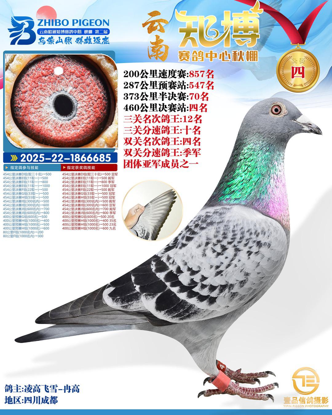 云南知博赛鸽中心20254凌高飞雪-冉高2025-22-1866685四川成都获奖鸽展示!