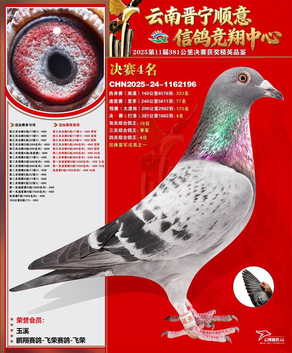 云南晋宁顺意信鸽竞翔中心2025决赛4名鹏翔赛鸽-飞荣赛鸽-飞荣2025-24-1162196玉溪获奖鸽展示!