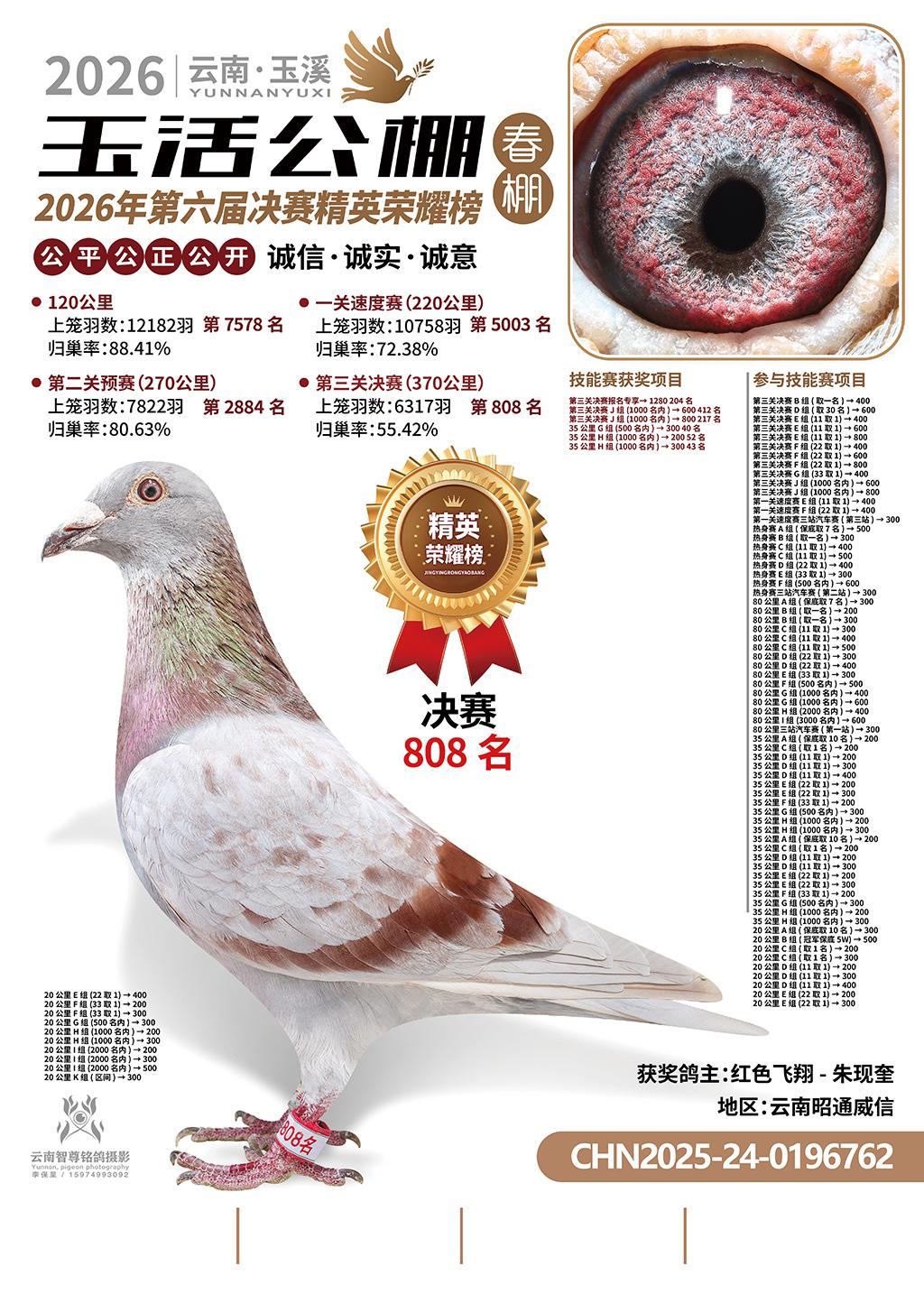 云南玉活公棚春棚2026决赛808名红色飞翔-朱现奎2025-24-0196762云南昭通威信获奖鸽展示!