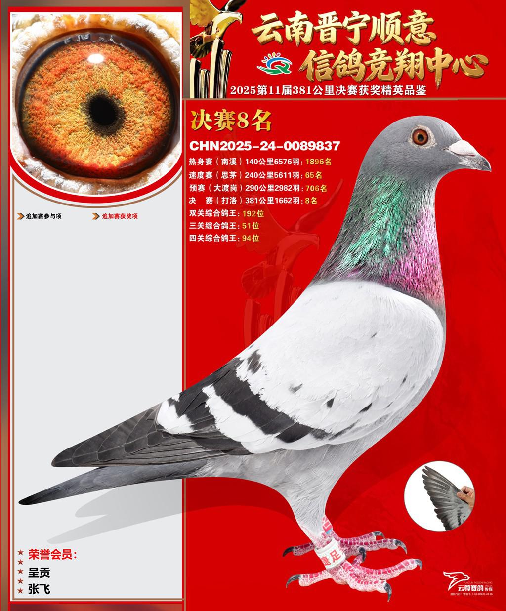 云南晋宁顺意信鸽竞翔中心2025决赛8名张飞2025-24-0089837呈贡获奖鸽展示!