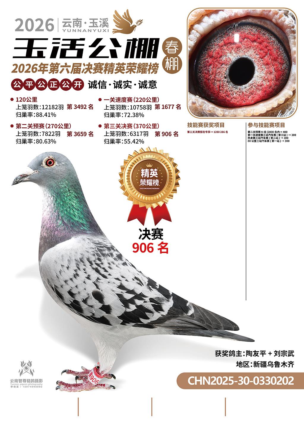 云南玉活公棚春棚2026决赛906名陶友平+刘宗武2025-30-0330202新疆乌鲁木齐获奖鸽展示!